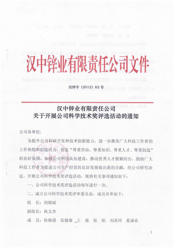 漢中鋅業公司關于開展科學技術獎評選活動通知